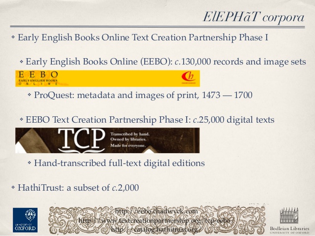 HathiTrust offers millions of digitized titles; EEBO-TCP is a smaller well-defined collection of texts from 1473 to 1700. The Early English Print in HathiTrust (ElEPHãT) project bridges them using Linked Data as a basis for exploratory research utilizing the respective strengths of the two corpora.