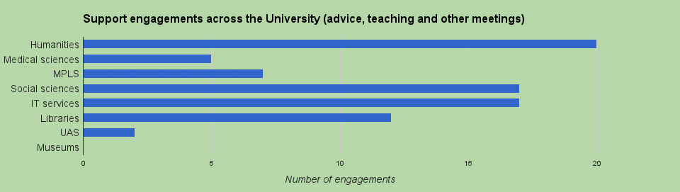 How many times the Research Support team engaged with different groups across the University i.e. 1:1 meeting to give advice or a taught course.