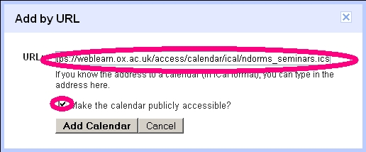 Then enter the WebLearn calendar URL and elect to make the calendar public.