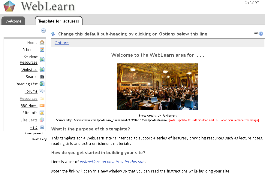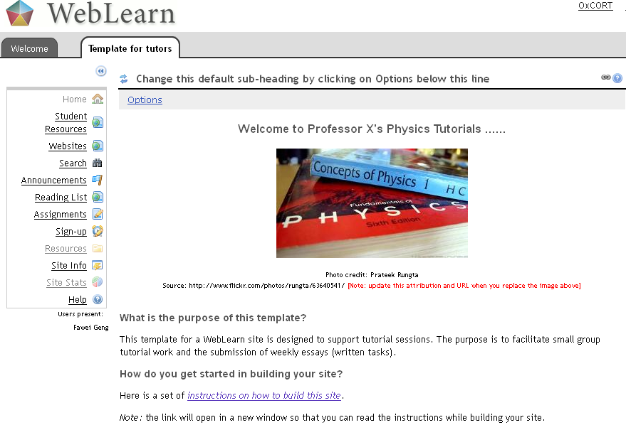 The recent upgrade to WebLearn version 2.8 has seen the introduction of a number of site templates. These templates can be used when creating a site from scratch and will impose structure and good practice before any content is added. In other words, much of the planning and layout has been done so that one does not need to start from a blank site.