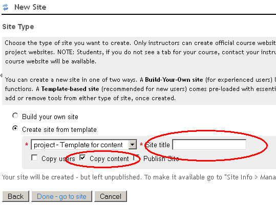 Once a template has been selected, be sure to select ‘Copy content’. Unfortunately it is also necessary to re-enter the ‘ Site title’ again.