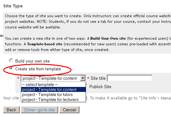 To invoke a template, one needs to click on the ‘New Site’ link as normal, enter the site URL and Site Title and then select ‘Create site from template’ on the ‘Site Type’ page.