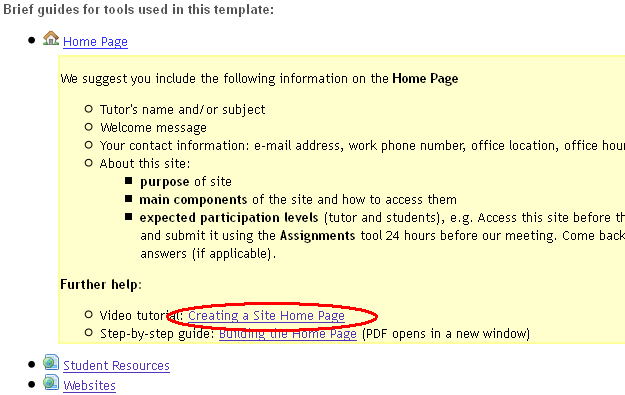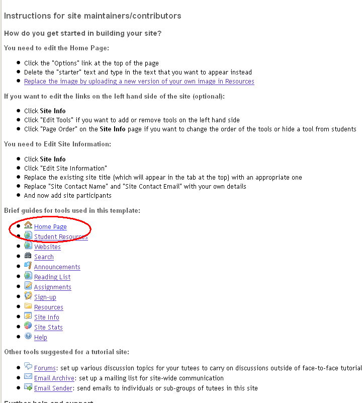 This includes facilitating small group tutorial work and the submission of essays (written tasks) possibly using the Turnitin plagiarism checking service. Tools added via the template are Announcements (for communication), Assignments (for written work submission), Sign-up tool (for tutorial bookings) as well as a number of other tools.