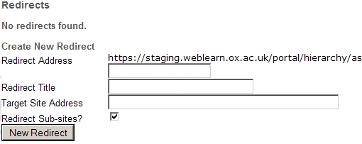 As an example, if Department X moves from Humanities to Social Sciences, the department’s sites can be moved and then a redirect can be put in place so that the old URL still works. The redirect would be from https://weblearn.ox.ac.uk/portal/ hierarchy/humdiv/deptX  to https://weblearn.ox.ac.uk/portal/hierarchy/socsci/deptX. You would almost certainly want all sub-sites to be redirected as well.