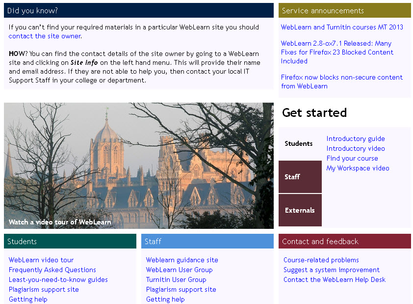 Go to https://weblearn.ox.ac.uk to view the new WebLearn Welcome page. The WebLearn team has responded to recommendations from last year’s WebLearn Student Experience Project and incorporated features that students asked for. These include a clear section on ‘Getting started’; separation of support materials designed for students and for staff; and more information about WebLearn features such as My Workspace, that they didn’t know about (see the collection of 30 ‘Did you know?’ items which are randomly displayed).