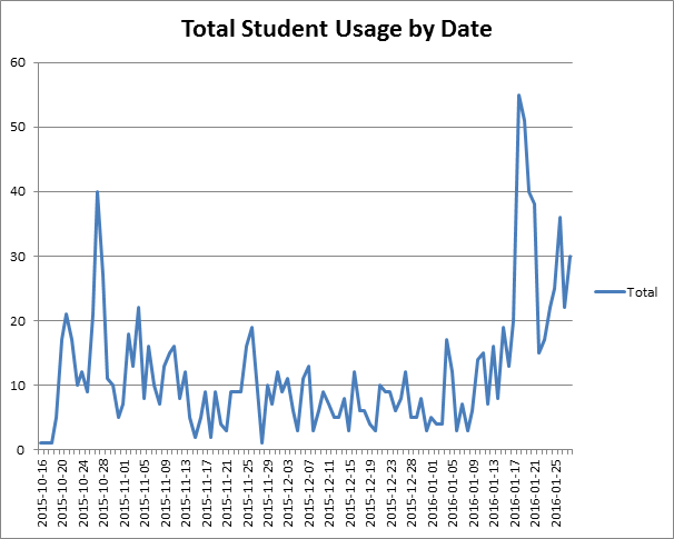 Our busiest day so far was 18/01/16, when we had 55 visits by students.