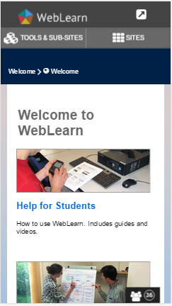 WebLearn automatically adjusts to the size of your device’s screen. If you are using a mobile phone, WebLearn hides the left hand menu and displays menus at the top of the screen, so you can see more of your page content.