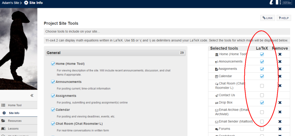 then enabling for individual tools via Site Info > Manage Tools (remembering to press ‘Save‘ at the bottom of the screen).
