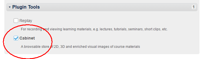 A new (external) tool called ‘Cabinet’ has been added to WebLearn. You can find it in the “Plugins” section of the “Manage Tools” page in “Site Info”.