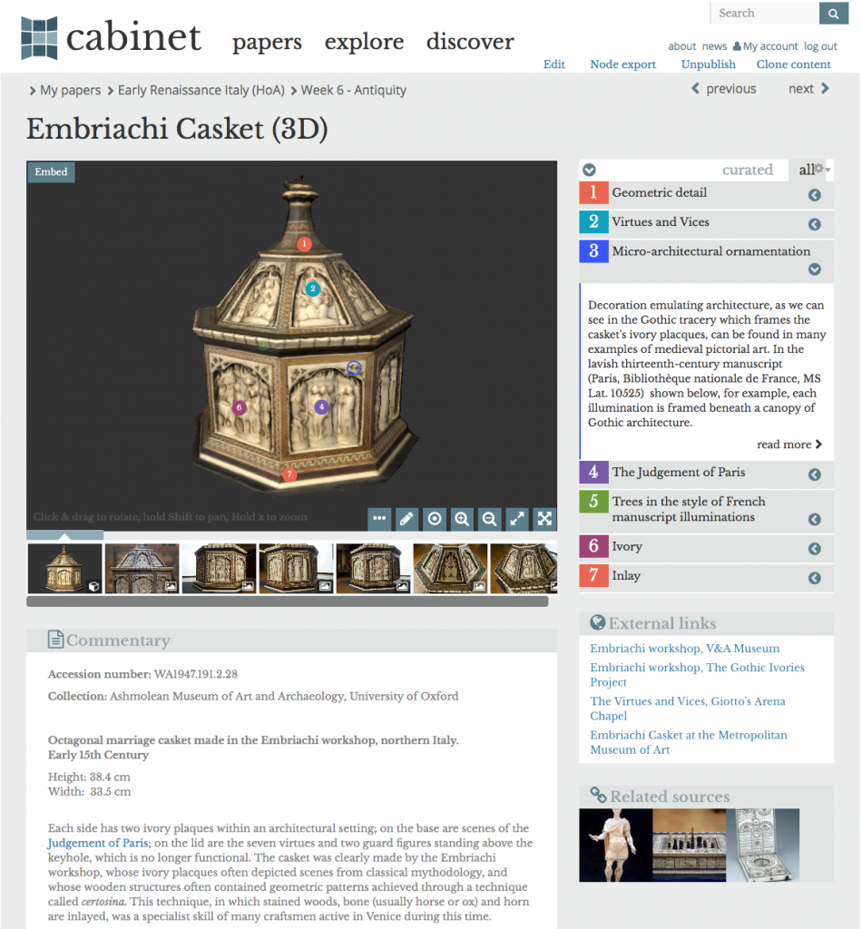 Digital technologies are revolutionising our ability to integrate objects and images into university teaching. Cabinet has been developed to support teaching with objects and images in 2D and 3D, using a range of visual materials from Oxford’s GLAM collections and beyond.