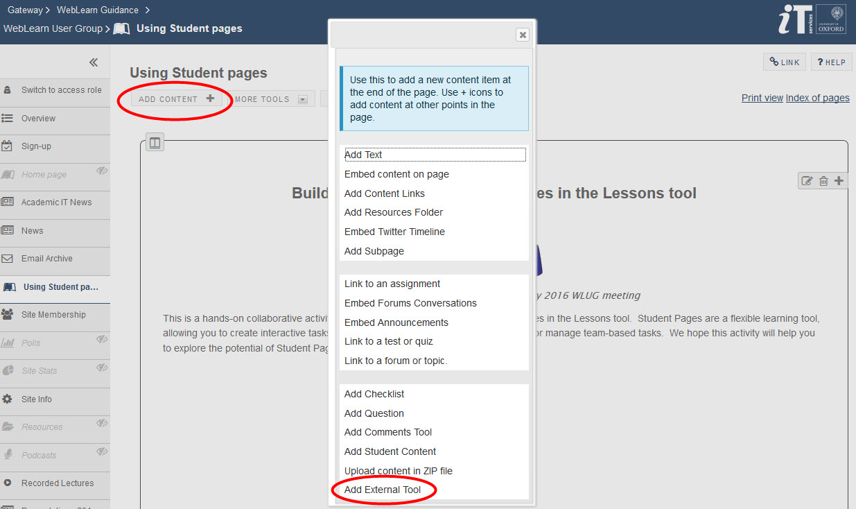 A new version of WebLearn (version 11-ox7) was released on Tuesday 3 October 2017. The main ‘headline’ is that authentication has now switched to Shibboleth in anticipation of the removal of the WebAUTH service. Other improvements have been made to Reading Lists, the Peer Assessment process and Anonymous Submission sites.
