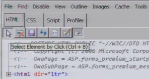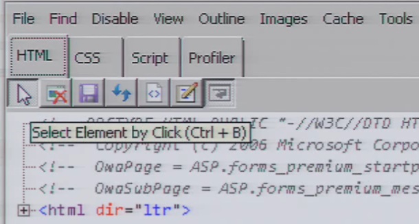 Now sooner or later we’ll need to move away from tinkering around the edges: there’s a hugely complex CSS file waiting to be edited. But rather than jump straight into it with notepad and scaring yourself silly, there’s an easier way. Open a session to OWA in Internet Explorer and then select ‘Developer Tools’ from the ‘Tools’ menu. You’ll see the bottom part of the screen change to show the CSS data that’s been used to generate the page you’re viewing.