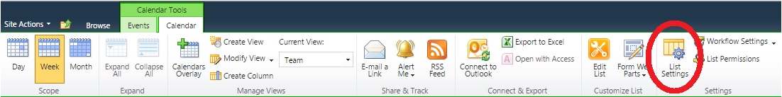 I’m starting with the assumption that you already have a SharePoint calendar, or know how to make one via ‘Create new content’. But you may not have the rights to do the tinkering: you need access permissions which are sufficient to let you play with list settings: