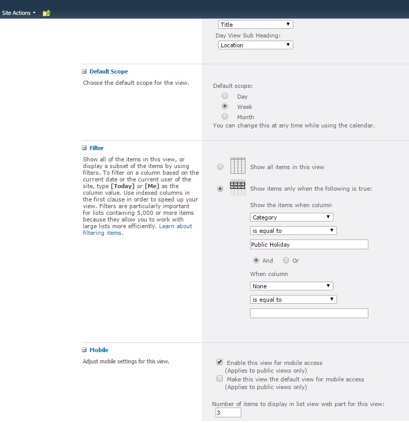 The things you might want to change are the ‘View Name’, the ‘Default Scope’ (most of the time the week view makes the most sense), and then the Filter. It’s the filter that is crucial to make all of this work.