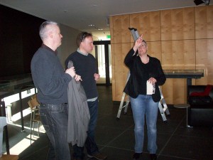 Dr Britta Woldering (DNB) discusses lighting with Dr Stuart Lee and Alun Edwards (Oxford University)