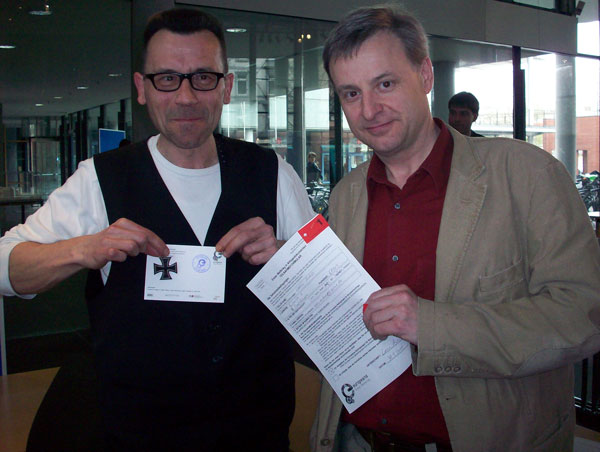 Our first contribution! Lorenz Andräs, (left) photographer for the DNB, holds an Iron Cross from his family history, with Dr Stephen Bull who holds the completed submissions form