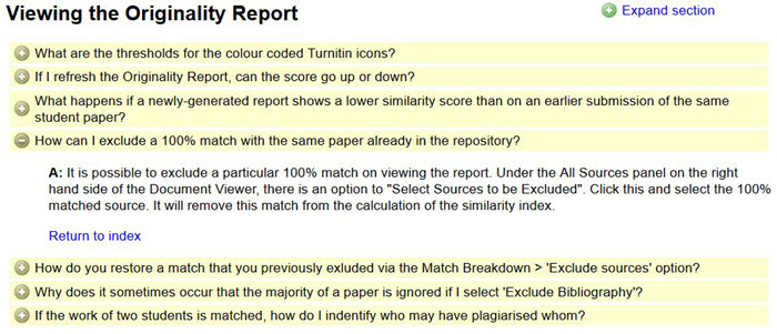 Turnitin would like more visibility of their “results” within VLE. There is growing acknowledgement that the most visible metric – the similarity score – is actually a fairly small part of the jigsaw. Most VLEs concentrate on showing a percentage match plus a colour code (green / amber / red) and this is the only indication that one sees in a VLE: a high percentage plus “red” indicator can be quite worrying for students.